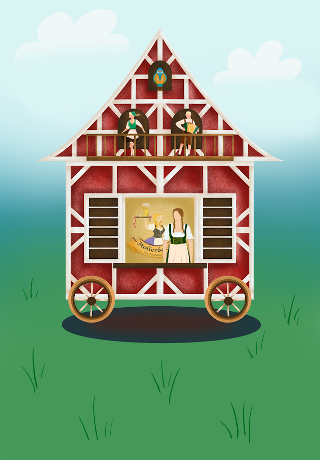 Designed for Small Project Studio in my Masters program, students were assigned to design a themed portable or mobile experience. We could choose any concept, but we had to use evidence based design to explain and back up why we chose our concept and why it made sense. I used Sketchup, Photoshop, and TwinMotion to model and render this project. I also used Procreate later on to create an illustration. Based on Hollerbach's authentic German restaurant in Sanford, FL, Hollerbach Zeitung is a mobile café that will sell the staples of authentic German street food. To appeal to more younger generations, they've decided to open an exciting mobile experience to spread the Hollerbach name across Florida and bring more people into Sanford to visit and see all they have to offer. It will also offer pre-packaged German delicacies and beverages, in reflection of Hollerbach's deli business. Inspired by German architecture, this mobile food stand was made to incorporate a cuckoo bird and small Polka dancer animatronics to come out at the top of every hour. A polka music artist would also be wondering the area with an accordion to provide entertainment to make people feel as if they are actually at the restaurant or in Germany.